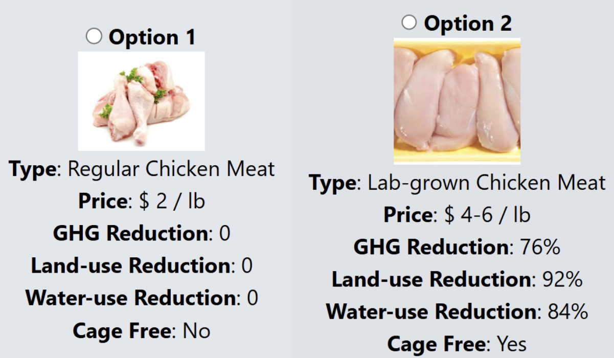 The core of the survey consisted of six two-alternative conjoint choice questions. Each question presented respondents with two hypothetical chicken products constructed from a predefined set of attribute levels specified in our experimental design file. The attributes included price, production type (conventional or lab-grown), cage-free labeling, and reductions in greenhouse gas emissions, water use, and land use.
