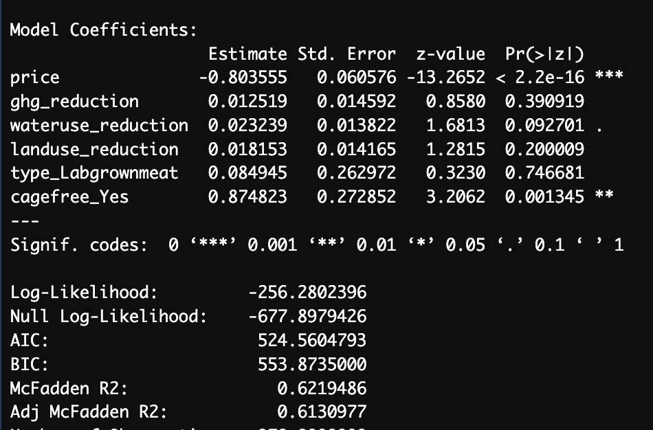 \[U_{ijt} =\beta_{price}\, price_{ijt} +\beta_{ghg}\, ghg\_reduction_{ijt} +\beta_{water}\, wateruse\_reduction_{ijt} +\beta_{land}\, landuse\_reduction_{ijt} +\beta_{lab}\, type\_Labgrownmeat_{ijt} +\beta_{cagefree}\, cagefree\_Yes_{ijt}+ \varepsilon_{ijt}\] As expected, the estimated model indicates a negative and statistically significant coefficient on price, while cage-free production yields a positive and statistically significant effect on utility. Environmental attributes display positive signs but are not statistically significant in this sample.